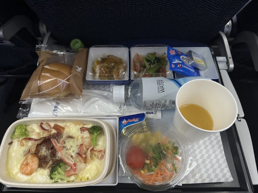 そして今回の機内食は、サラダ、惣菜が2種類、パン、チーズやクラッカーがついていて、メインは2つのメニューから選べるスタイル。私はグラタンを選んだのですが、濃厚でとても美味しく、ワインにもぴったりでした。