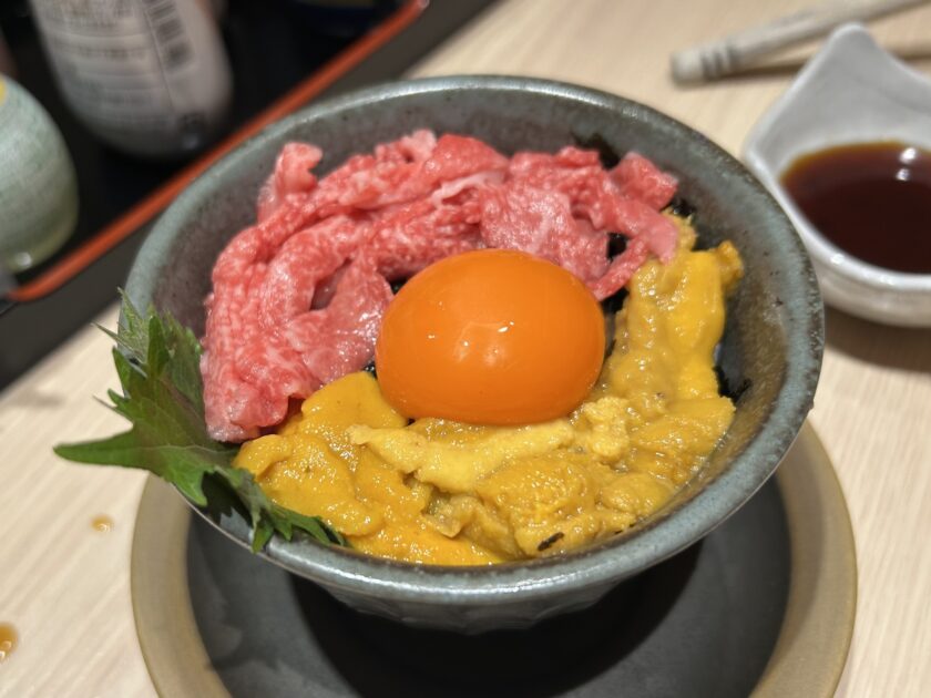まず食べたのは、ユッケとウニがたっぷりのった贅沢丼。運ばれてきた瞬間、その豪華な見た目に思わず目を奪われました。新鮮なユッケはとてもなめらかで、濃厚な卵黄と絡めるとさらにコクが増します。そこにウニの甘さとクリーミーさが合わさって、ひと口ごとに幸せを感じる味わいでした。ごはんとの相性も抜群で、最後まで夢中で食べてしまいました。
