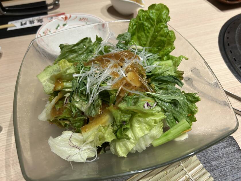 そして最初にいただいたのは「凱旋門サラダ」です🥗 新鮮な野菜がたっぷり入っていて、見た目もとても彩りがきれいでした。シャキシャキとした食感が気持ちよく、さっぱりとした味付けで焼肉の前にぴったりの一皿でした。こういうサラダがあると、バランスよく食事を楽しめるので嬉しいですよね。