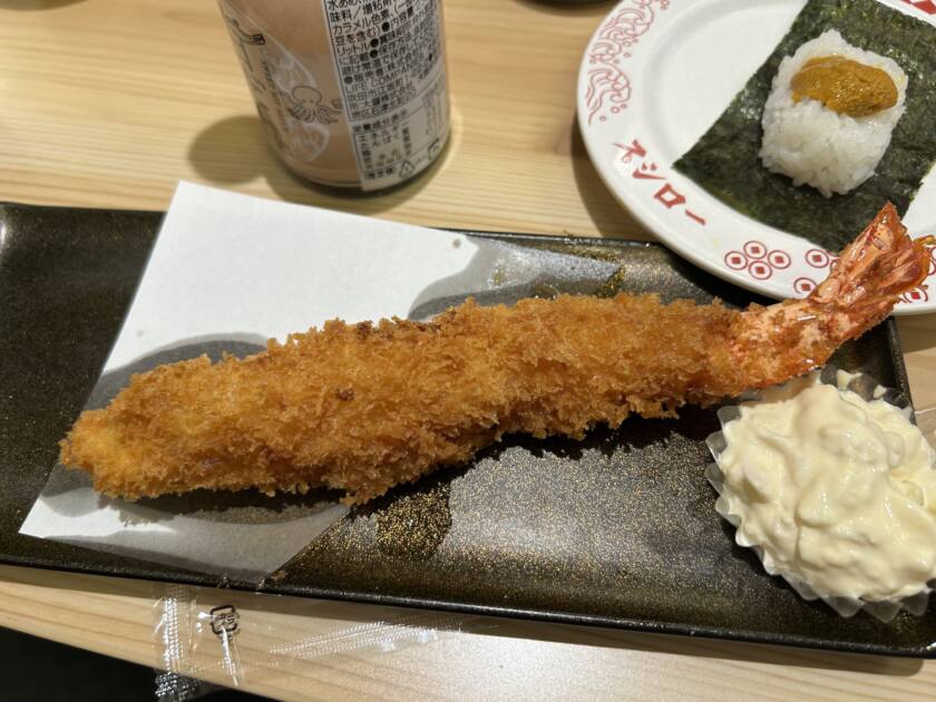 続いていただいたのはエビフライです🍤 揚げたてのサクサクとした衣がとても香ばしく、中のエビはぷりっとした食感でとても美味しかったです。お寿司屋さんでエビフライを食べる機会は意外と少ないですが、こういうフェアのときに楽しめるのも嬉しいポイントだと思いました。