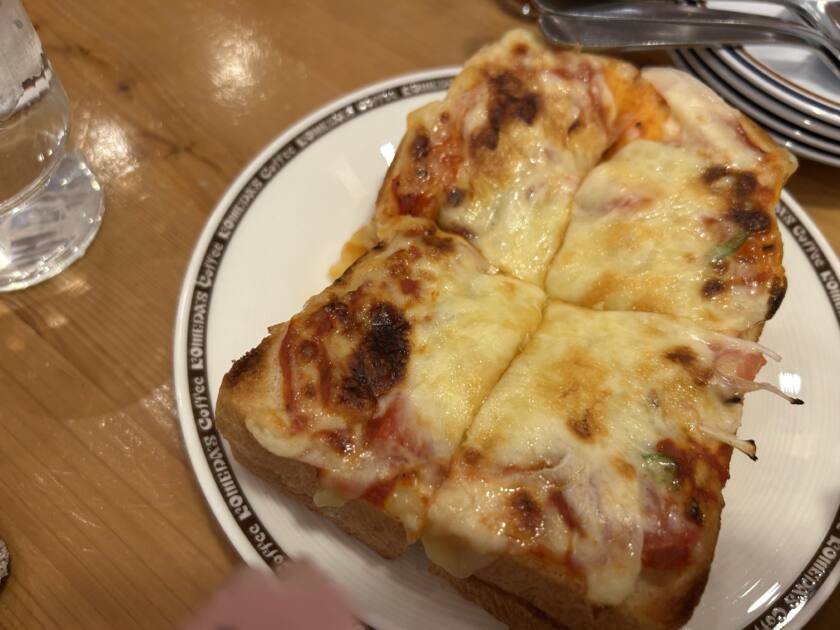 そして楽しみにしていたピザトースト🍕🍞 コメダといえばこのメニューを思い浮かべる人も多いのではないでしょうか。厚切りのトーストに、たっぷりのチーズと具材が乗っていて、とてもボリュームがあります。チーズがとろっとしていて、トマトソースの味もしっかり感じられてとても美味しかったです。パンは外側が少しカリッとしていて、中はふわふわで食べ応えも抜群でした。