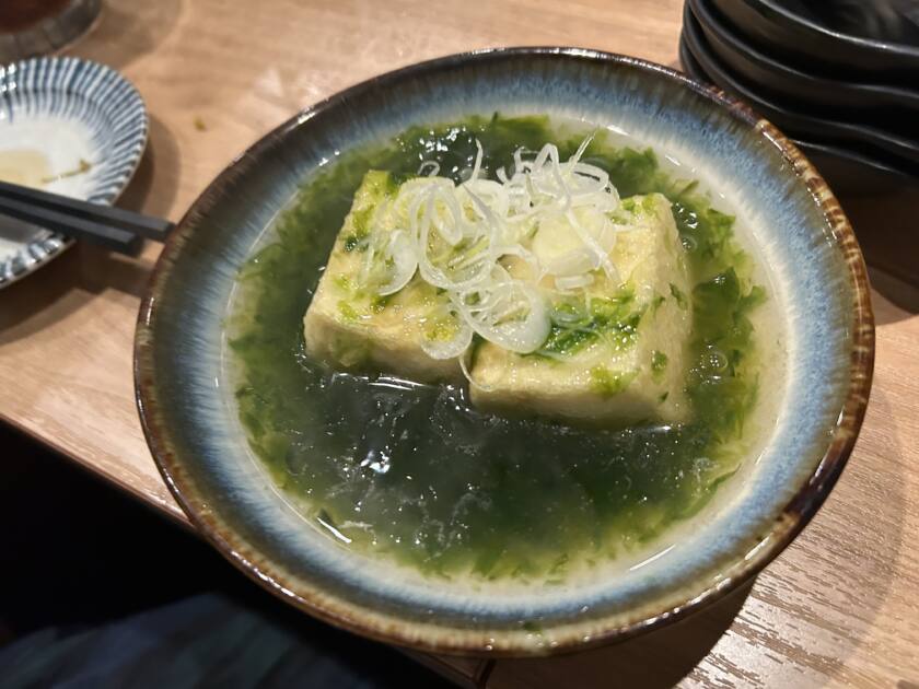 これは今回の中でも特に印象に残った一品です!外はカリッと、中はとろっとした豆腐に、あおさの香りがふわっと広がる優しい味わい✨ 出汁がしっかり染み込んでいて、ひと口食べるごとにほっとする美味しさでした。あおさの風味がアクセントになっていて、普通の揚げ出し豆腐とはひと味違う特別感があります😊